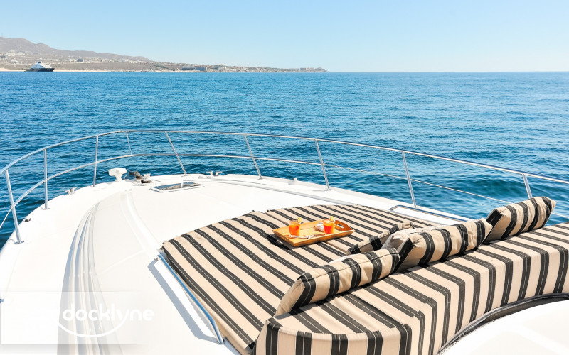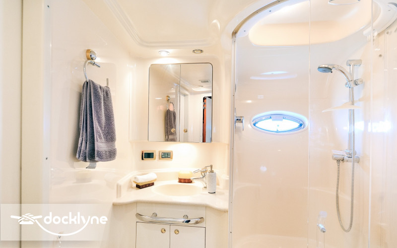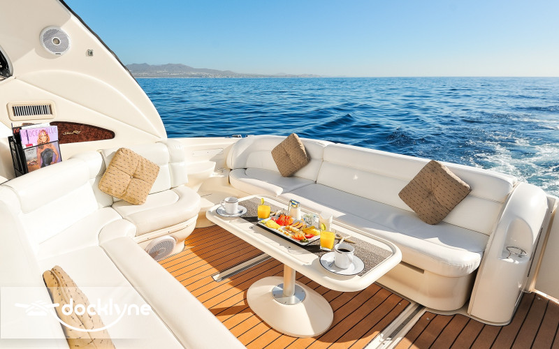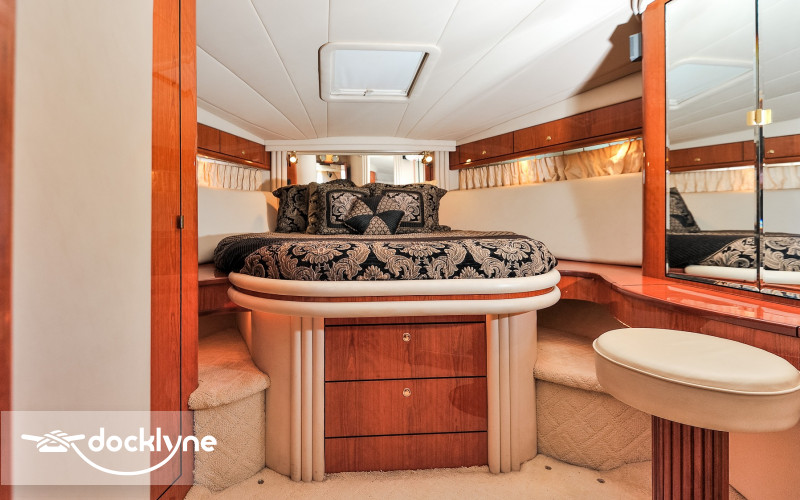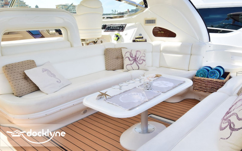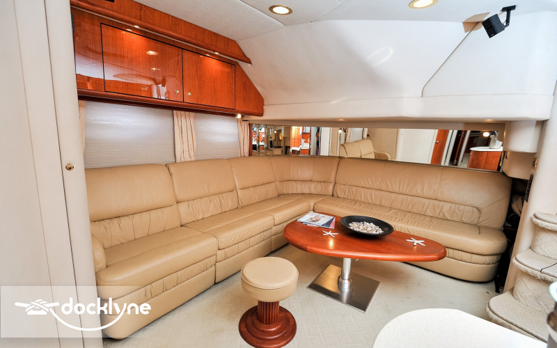 This beautiful sports yacht surpasses all expectations. Her interior 7-foot head room throughout the downstairs salon along with outdoor cockpit seating for 12 makes this yacht truly the largest most comfortable yacht in its class. Starting aft, the large swim platform is hydraulic and can be lowered to sit in the water. The aft deck has a white “U” shaped seating arrangement with 22” Flat Screen TV for all to see. This epicenter of fun is further offset with teak looking carpet that is soft on the feet. The center cockpit table is the perfect size to enjoy a wonderfully prepared breakfast or a champagne toast and appetizers during sunset. Part of the cockpit seating further electrically converts to a large 2-3 person lay flat sun pad. A wet bar and ice maker are built in to make entertaining easy.