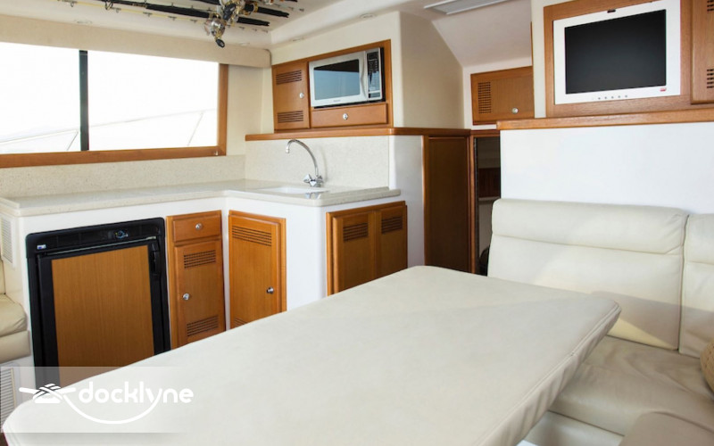 KNOT WORKIN is an impeccable 35 FT 2004 Cabo Flybridge, offering comfort and performance for groups of up to six guests. Caterpillar 3126 twin engines offer a top speed of 34 knots and cruising at 22 knots. Considered one of the best sport fishers every built, this model is designed specifically to fish the waters off of Cabo San Lucas. The spacious cockpit has a professional fighting chair, live bait well and tackle center, as well as refrigerated fish box and shaded seating outside. The salon has cream colored couch, dinette for six & compact galley, as well as T.V and sound system. A squeaky clean bathroom is featured on the starboard side next to one of two guest cabins. The forward cabin has a queen size bed with Tommy Bahama bed covering. The flybridge is shaded and has seating for several guests. Full electronics including radar, sonar & GPS as well as a full complement of Shimano & Penn tackle ranging from 20 to 80 lb. class. The overall condition of Knot Working is excellent.